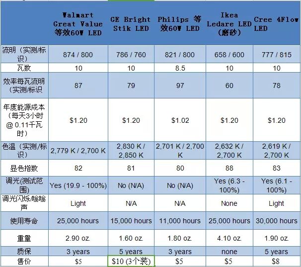 沃爾瑪廉價的LED燈泡是測試中等效60W燈泡中最明亮的之一,且在接近900流明時色溫更高,每個燈泡售價不到5美元,是目前經濟實惠可調光LED燈泡的優選。