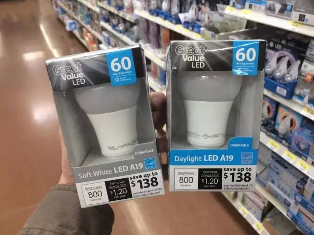 其中一個物美價廉的選項就是沃爾瑪貨架上銷售的可調光等效60W LED燈泡,品牌為“Great Value”、售價僅為4.88美元。該價位又具有可調光功能,是其另一大賣點,如飛利浦等效60W LED和GE Bright Stik LED雖然也為低價選項,但不可調光。而且,沃爾瑪的這款LED也明顯比那兩個亮,并承諾更長使用壽命,為25000小時。