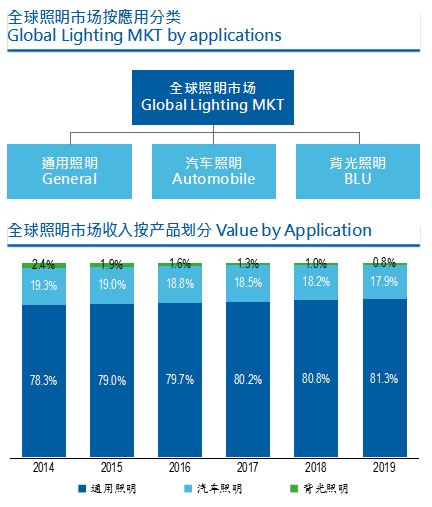 林紀(jì)良先生援引資料表示,全球照明市場(chǎng)整體規(guī)模到2019年預(yù)計(jì)將達(dá)到1287億美元,2014年至2019年年復(fù)合增長(zhǎng)率預(yù)計(jì)達(dá)到4.6%。按產(chǎn)品劃分,全球照明市場(chǎng)可分為通用照明、汽車(chē)照明和背光照明。其中,通用照明為主要產(chǎn)品,占整體全球照明市場(chǎng)總額的80%左右。