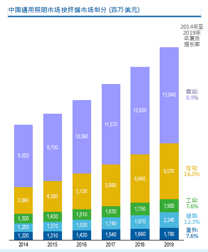 按終端市場(chǎng)劃分,中國(guó)通用照明市場(chǎng)可分為商業(yè)(包括酒店、辦公及商店)、住宅、工業(yè)、建筑及室外五大市場(chǎng),其中商業(yè)領(lǐng)域是最大的市場(chǎng)板塊,占2014年整體市場(chǎng)規(guī)模的54.2%。而受益于城市化進(jìn)程以及繁榮的房地產(chǎn)行業(yè)發(fā)展,住宅領(lǐng)域預(yù)計(jì)為2014年至2019年增長(zhǎng)最快的領(lǐng)域,復(fù)合增長(zhǎng)率達(dá)到16.0%
