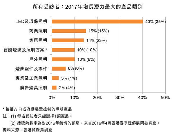在10月進(jìn)行的調(diào)查中,最多業(yè)者認(rèn)為L(zhǎng)ED及環(huán)保照明是2017年增長(zhǎng)潛力最大的產(chǎn)品類(lèi)別,獲40%受訪(fǎng)者選擇。LED照明中,被視為增長(zhǎng)潛力最大的主要應(yīng)用領(lǐng)域?yàn)槭覂?nèi)家居照明、智能照明系統(tǒng)以及室內(nèi)辦公室及商業(yè)照明,分別獲32%、21%及14%受訪(fǎng)者認(rèn)同。