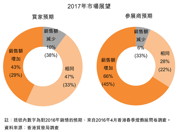 在秋季燈飾展上,43%受訪(fǎng)買(mǎi)家及66%受訪(fǎng)參展商預(yù)期2017年的銷(xiāo)售額較2016年有所增加。值得注意的是,這個(gè)比率較今年4月同一展覽的調(diào)查結(jié)果顯著上升。至于預(yù)期明年銷(xiāo)售額減少的受訪(fǎng)者比率則有所下降,分別僅占受訪(fǎng)買(mǎi)家的10%和參展商的6%。整體來(lái)說(shuō),縱然今年燈飾業(yè)銷(xiāo)售表現(xiàn)平平,但業(yè)界對(duì)2017年市場(chǎng)前景頗感樂(lè)觀(guān)。