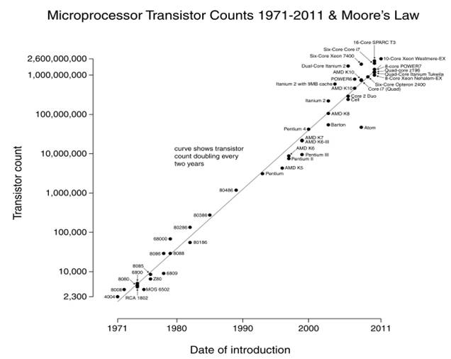 ▲ 圖一:?jiǎn)挝幻娣e芯片的數(shù)目:微觀的摩爾定律