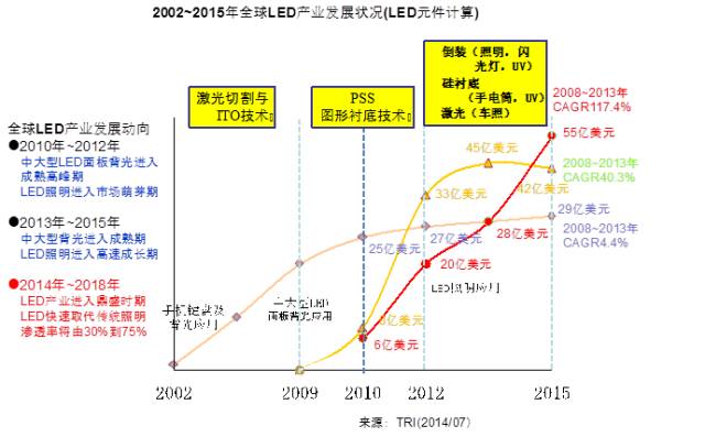 ▲ 圖四:2002年到2015年LED技術(shù)與市場(chǎng)應(yīng)用趨勢(shì)圖