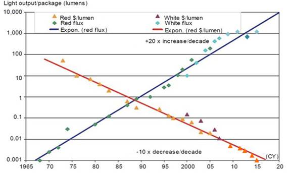 如圖三所示,這個(gè)定律預(yù)測(cè)LED的價(jià)格每10年將為原來(lái)的1/10,輸出流明則增加20倍,如圖三所示,從第一顆可見(jiàn)光紅光商業(yè)化的1962年到現(xiàn)在,這個(gè)定律看似完美無(wú)缺的精準(zhǔn)預(yù)測(cè)LED的技術(shù)與價(jià)格發(fā)展趨勢(shì)。