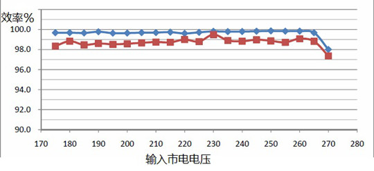 由圖中可以看到,當環境溫度從35度升高到85度時,整個效率隨輸入電壓變化曲線幾乎完全一樣,始終保持在98%以上(包括了整流器的效率在內)。